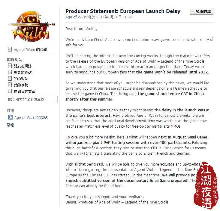 我们将会在未来的几个星期中和你们分享这些信息,九阴真经欧服之前的发布日期,已经从今年年初推迟到一个无法确定的日期,今天,我们不得不告诉欧洲的九阴迷们,这个游戏将不会早于2012年发布。