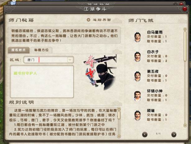 今天来介绍下抢夺秘籍活动,这个活动是每天晚上7点到8点,随即挑选一个门派,其他门派去这个门派抢书,这个门派护书。奖励还算不错,不过也不是那么容易抢的哦!