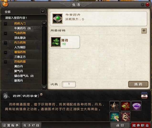 九阴真经的药师在目前来说用处还是比较大的。除了能做一般回血回魔的药外,还能制作加快历练转换的药,这个在目前来说还是比较有用的。