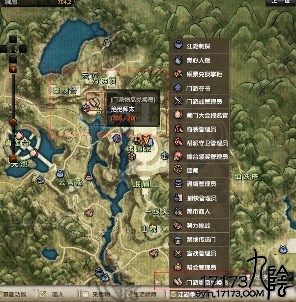 峨眉兑换人位置,可以通过打开地图江湖争斗中的门派兑换人查找到: