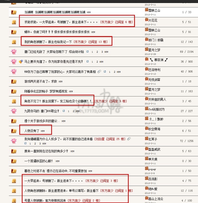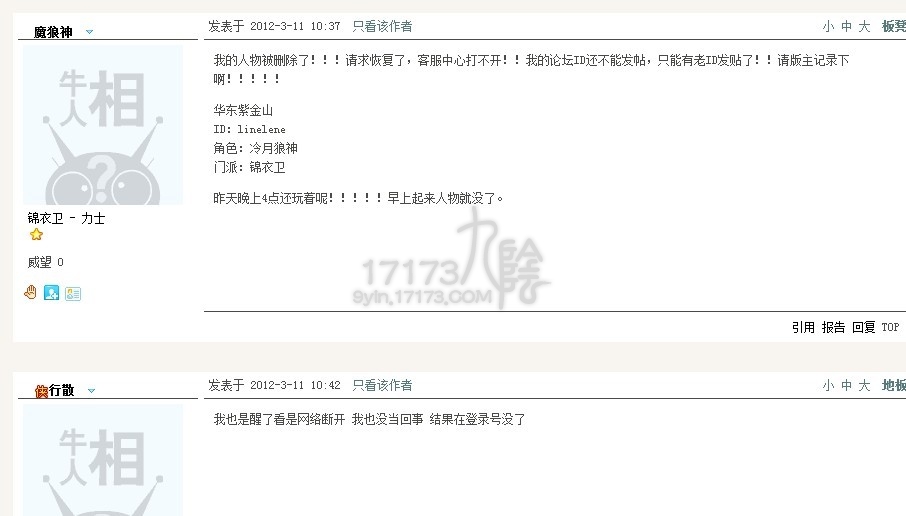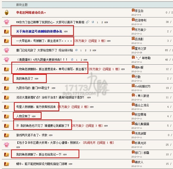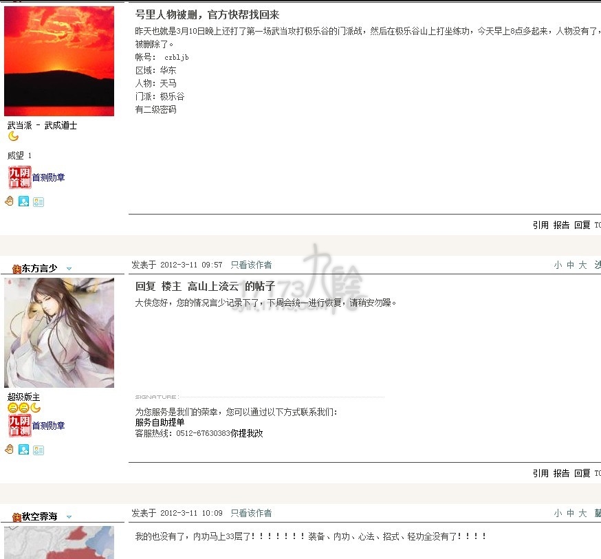 17173九阴记者一笑倾国报道:2012年3月11日,九阴真经(新手、门派、轻功、奇遇)的论坛上,哀鸿遍野,无数大号小号一夜之间被莫名奇妙的全部删除。好吧,记者我的大号也被删了。