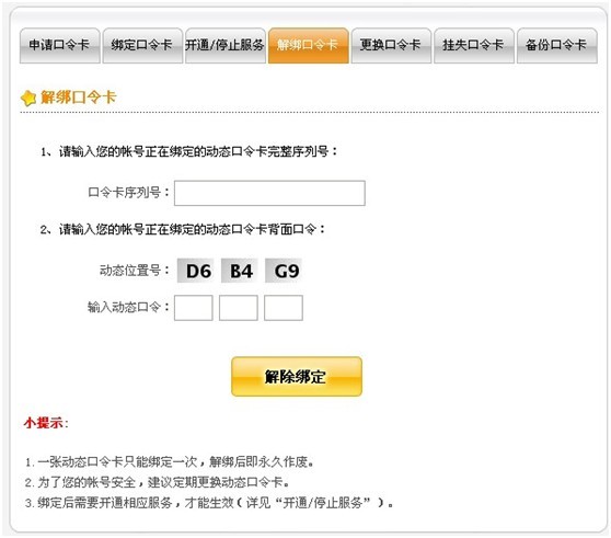 4. 解绑口令卡。您只需要输入您的帐号正在绑定的动态口令卡完整序列号,以及对应的三个动态口令,即可解除绑定;
