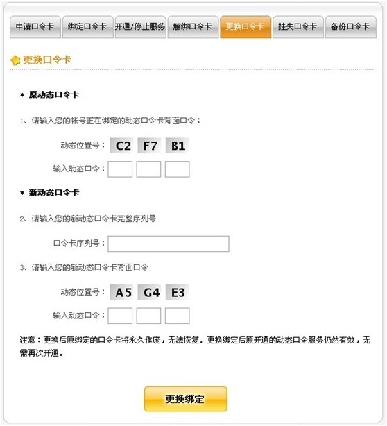 5. 更换口令卡。先输入原动态口令卡的三个对应动态口令,再输入新动态口令卡的序列号及对应动态口令,即可更换绑定;