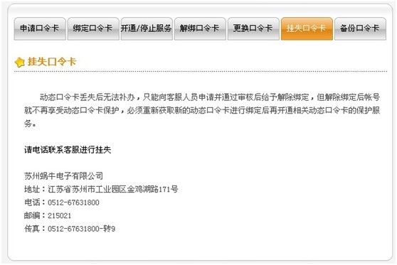 6.挂失口令卡。动态口令卡丢失后无法补办,只能向客服人员申请并通过审核后给予解除绑定,但解除绑定后帐号就不再享受动态口令卡保护,必须重新获取新的动态口令卡进行绑定后再开通相关动态口令卡的保护服务;