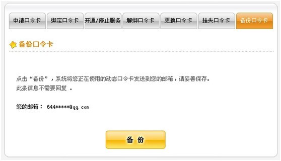7. 备份口令卡。点击"备份",系统将您正在使用的动态口令卡发送到您的邮箱,请妥善保存。