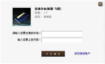 7. 输入需要出售的价格和上架天数后,按 [点击确定]按钮,物品上架成功。