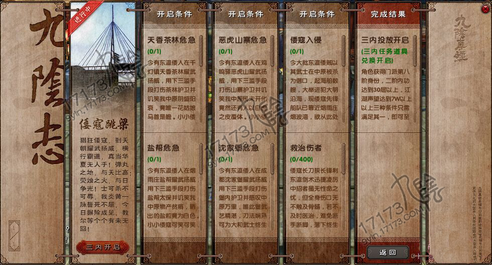 九阴志是查看九阴江湖事件(整个服务器所有玩家共同进行的事件)进程的一个界面。当三内江湖事件完成后,三阶内功的投放立即开启!
