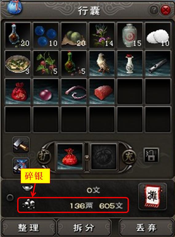 获得方式:通过做任务、踢馆、挑战禁地等方式获取。(非江湖名俊玩家碎银子的携带上限为8锭,江湖名俊玩家碎银子携带上限为30锭,每天消耗碎银上限为360两)