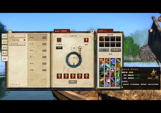 界面中的蓝色圆圈则是经脉升级槽,当蓝色的真气转满一圈后可以升级经脉层数,经脉层数达到一定等级可以开启经脉被动武技。玩家一共有九条经脉可以修炼,每条经脉都能修炼到九层。玩家的门派内功修炼到一定层数即可开通一个穴位并且提升经脉可修炼层数上限,每个穴位开启后都会获得武技点。