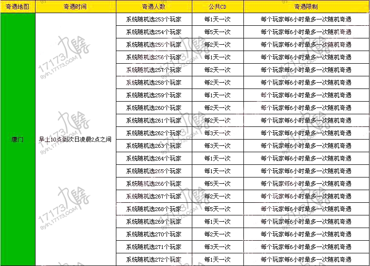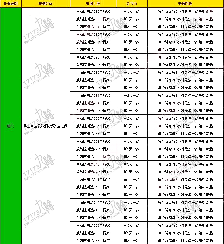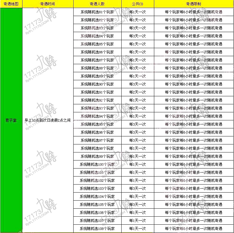心血来潮解包了一次客户端,发现了一点点的不一样,之前奇遇说的是需要场景人数和公**,而现在的规则则是一天内从场景里随机选几个人,然后送出奇遇。下面是每个场景的奇遇以及公**时间!(这只是针对随机奇遇,固定人物的奇遇,还是需要靠大家去刷好感。)