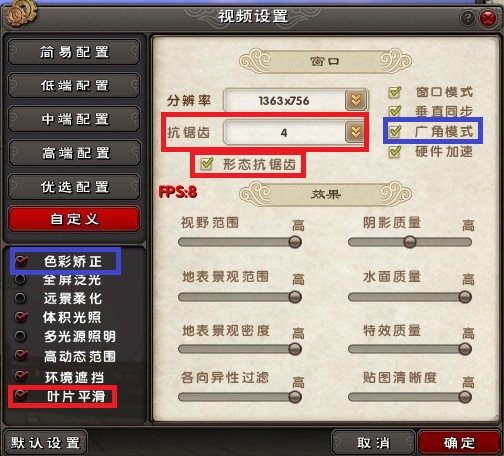 2、视频设置打开开启高效,自己调节一下,千万别忘了开抗锯齿。看情况要不要开广角和颜色校正。