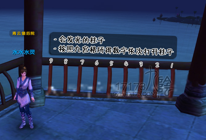 九阴真经(新手、门派、轻功、奇遇)青云堡断桥机关攻略,老一到老二的路上有一个荷花塘,塘上有座桥,共有4个机关(都一样)。机关就是九宫格配合开柱子。