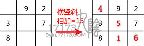 根据九宫格原理,横竖斜等于9,填进缺少的数字。然后排列所有数字(从左至右,从上至下读取)。以上的为:4 9 2 3 5 7 8 1 6