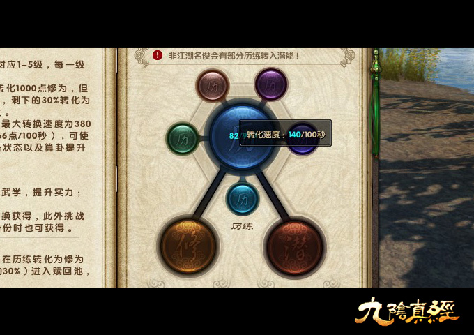 那么如何才能更快的获得修为呢?这就要提到历练转化修为的速度了。1点历练在不使用任何药物及不完成任何活动或任务时的转换修为的速度是每100秒转化140点修为。而游戏设定的是每点历练最多可转换1000点修为,那么如何提升转化速度呢?非江湖名俊的玩家不做任务不吃药的最大转化速度是100秒转化266点,江湖名俊玩家则是100秒转化380点,而且非江湖名俊玩家在历练转化时将有30%修为进入潜能里,这30%的潜能只能用黄金赎回。所以江湖名俊100%历练转化不损失修为就比起不是江湖名俊的玩家修为多了很多。