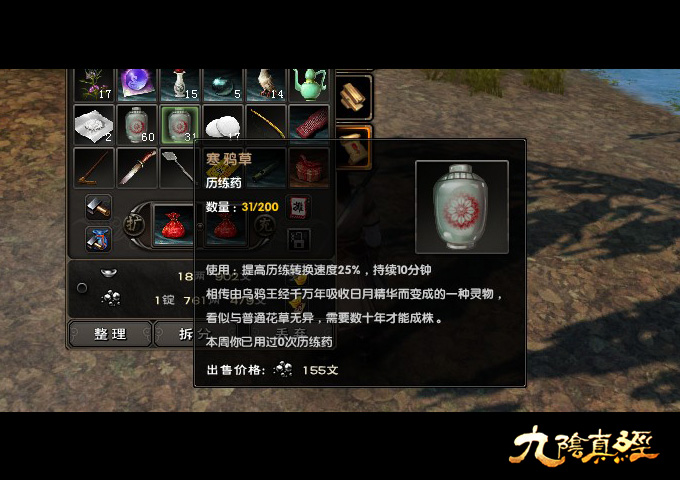 游戏中最常见的历练转化提升药物寒鸦草,持续时间短,转化提升速度低