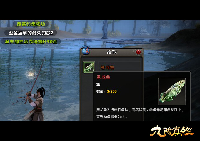 当鱼移动到鱼钩处则会提示此次钓鱼成功,同时系统弹出拾取界面,将鼠标移动上去能够看到鱼的小简介以及数量。