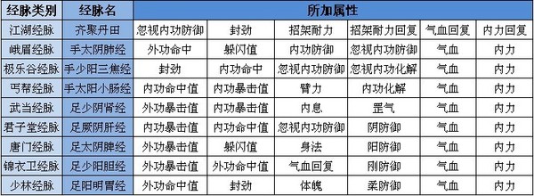 大家可以看到,除了江湖经脉,其他8条门派经脉,都有加气血和内力,其他属性有所不同