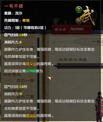 一毛不拔:这招式格挡加状态,能叠4层,效果是外防加2000、内功防御加200个。人感觉抗怪抗BOSS神马的很实用,特别是在BOSS技能秒人的龙门,200内防效果还是很明显的,跟剑生太极不相上下。