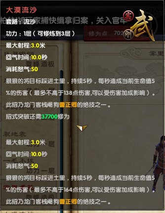大漠流沙:怒气招,不错这招看起来霸气无比,硬控制5秒,被踩进土里后不能移动、出招,可以格挡,伤害也不俗,但是这招只能对倒地目标使用。