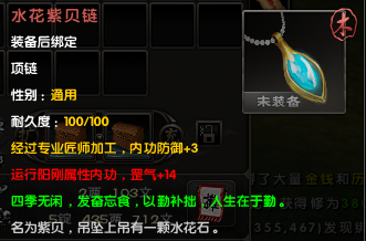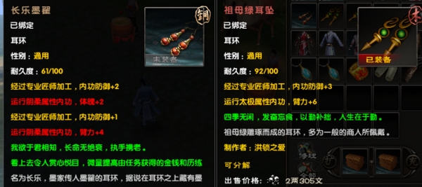 其中的“运行太极属性内功,臂力+10”这样的附加属性为裁缝开光所得,而这也是判断一个装备是否值钱的最重要的部分,因此找个人品好的裁缝给你开光可是很重要的