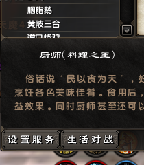 其中也有许多主流的食物,厨师除了做吃的,再就是武器开光了,而且厨师首开的武器不会出技能全部都是伤害和破防,厨师是初期很多人被逼无奈选择的职业,因为饿啊,人以食为天嘛,但是其实厨师在某些情况下市场并不乐观,而且作为厨师由于出产量大(两个小麦一个馒头),需求量相对较小(所有物品持续时间为一个小时),而且单个物品价格较低,很多厨师一直在保养别人,东西都是送的,由此带来了很多厨师的怨念,虽然我一直都是送东西给帮里人,基本上做出什么好东西先是一顿乱分,然后就没了。。。(其实反正自己也吃不了)但是个人不会觉得不爽什么的,好吧,我就是个好人。。。