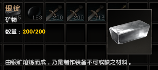 矿产类需求量其实总体来讲都非常大,所有武器、首饰和一部分中间材料都需要用到这些,这里着重点出了市场价格较高的几个:银锭,这货是铜级别及以上都需要用到的材料,主要分布地点是大漠和金陵,在各个门派也各有一个定点,比较推荐的采集地点是大漠和金陵了,而且银矿会随机在这两个地图上出现,所以个人推荐不要蹲点,而是能有一个路线围着地图上几个重要的点转一圈,银矿会不定向的出现在地图提示地点附近的地方,所以蹲点对于银矿采集是不好的一种习惯,不过门派银矿采集点可以蹲点,十分钟一刷,而且位置较为固定,不会有太多偏差。。。铅矿和龟纹石现在唯一开放的地点就是苏州,由于采集点少,而且也具有一定的随机性,需求量又较大,是个好东西,龟纹石是铅矿的特殊产物,制作耳环等时会用到