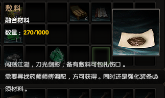 不同品质的武器装备会分解出不同级别的分解材料,然后再通过分解材料和一些其他的材料(比如药师的药布需要薄荷,毒师的毒石需要红粉白株)可以合成开光材料,而且提醒一句,不管是分解装备还是合成材料都是需要碎银的哦,那些天天吵着银子花不完的如果有一天大量的进行这些准备材料的工作碎银会十分不够用的。。。