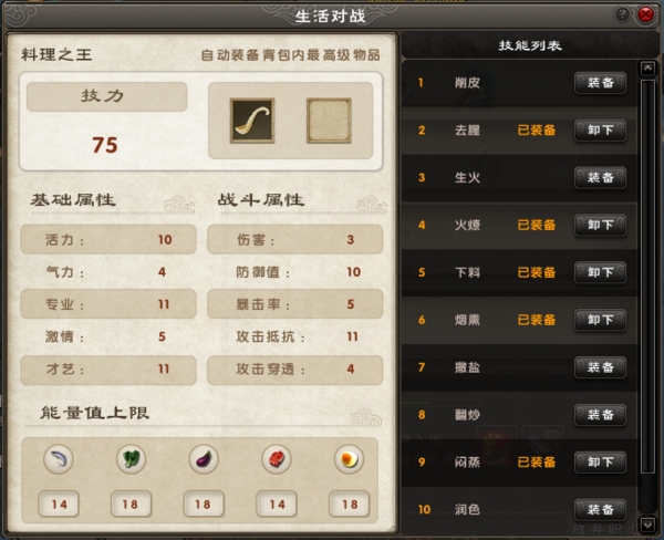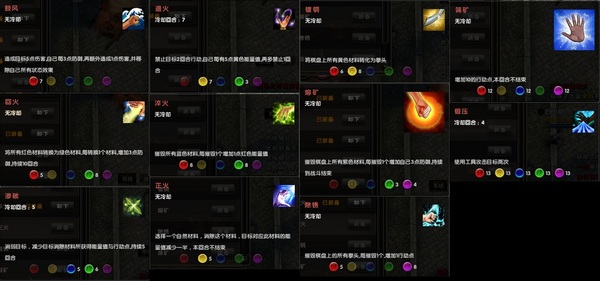 彩色元素,相当于是万能宝石,其他的部分,拿厨师举例:肉是红色、馒头是黄色、鱼是蓝色、菜是绿色、茄子是紫色。。。其他职业也一样,共有5种颜色的能量,每次消去对应颜色后就会获得一定量的能量值,若消去部分含有万能宝石,所有颜色能量会加1,能量槽是会满的,能量槽的最大值会根据玩家的生活职业等级获得提升。。。再下面的区域4是技能栏,每个技能都会有相应的介绍,如果能量槽中的能量满足了技能文字下方对应所需能量的数量的话,技能会变亮可以使用,关于技能效果在之后各职业介绍上会讲。。。位于中间的5区域就是我们的主战场了。。。再上面的6区域是当前回合可操作的剩余时间。。。其他部分对称过去就是对手的相关信息了。