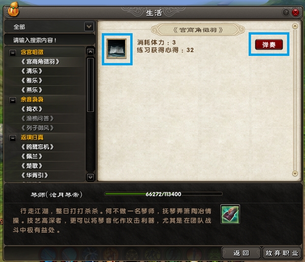 右键左边蓝框是战斗模式,选择弹奏进入练习模式,战斗模式每曲弹奏完只消耗1点琴的耐久,完成一曲后会有5sCD,下面依次上战斗模式和练习模式的界面: