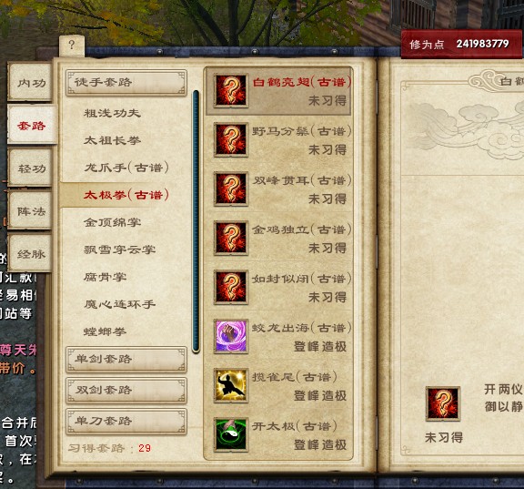 太极拳 = 辅助技能强大,拦雀尾保命神技,开太极搭配任何套路都无敌。(目前被削弱)其他招式,除了蛟龙出海,基本没太大用,是江湖套路里面最弱的一套。