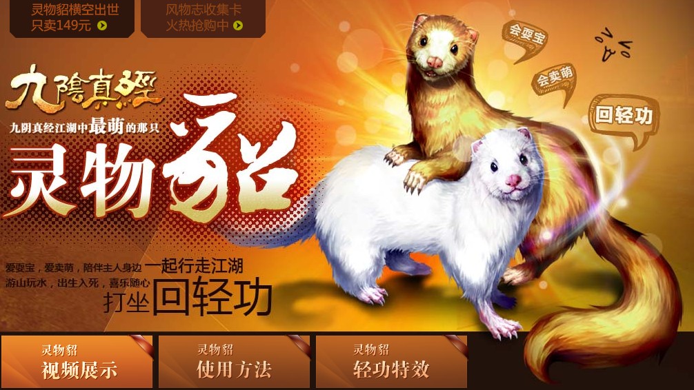 你是否还记得《神雕侠侣》中那只陪伴瑛姑的雪貂?你是否还记得《天龙八部》中钟灵所豢养的闪电貂呢?现在,在九阴江湖之中,您也可以与貂相伴,行走江湖了。它,可在漫长的江湖路上与您相伴,使您行走江湖不再孤单;又可表演特技与您互动,让您的江湖之路充满温馨快乐;更可助您轻功(获得、演示)再上一层楼。如此可爱的灵物貂,你值得拥有!