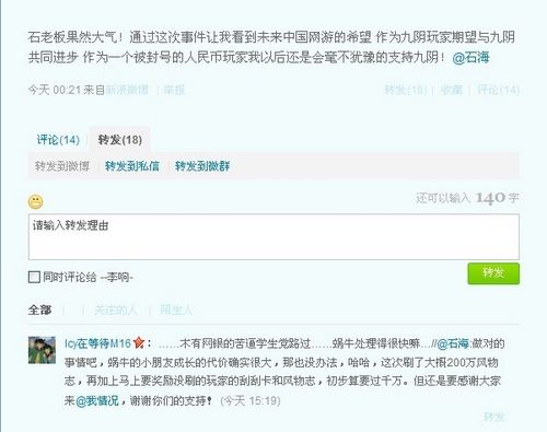 石海表态过后,有参与了此次事件而暂时被封号处理的玩家迅速回复称:“通过这次事件让我看到未来中国网游的希望,作为九阴玩家期望与九阴共同进步,作为一个被封号的人民币玩家我以后还是会毫不犹豫的支持九阴!”