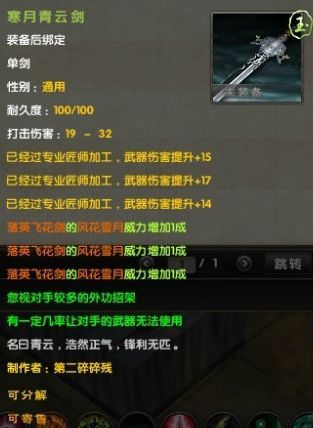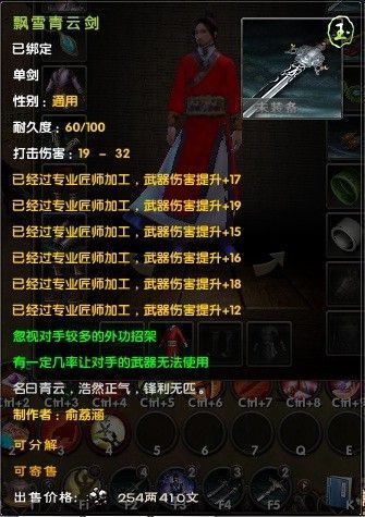近日有玩家在论坛上晒其最新制作的一把六开武器——寒月青云剑,三开伤害,三开君子堂最热门技能风花雪月。对此不少玩家惊讶不已,有的玩家认为此武器可以卖出3000元人民币,有玩家认为可以卖到5000元人民币,更有甚者表示如果这把武器出现在自己所在的武侠服“侠骨丹心”服务器,卖给土豪10000元人民币毫无压力。更令玩家称奇的是,随后一个玩家上传了一把更为令人更为瞠目结舌的武器——飘雪青云剑,六开全伤害。六开伤害的剑相对于上一把适用于更多的套路,无疑具有着更广阔的市场,价值更加难以预估。无论如何,制作此类武器的玩家无疑可以从中获取不菲的收益。