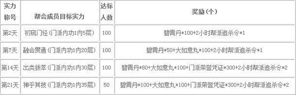 注:系统在各结算时间点统计各帮会符合要求的成员实力及数量,符合获奖条件的将在3个工作日后进行发奖,活动期间更换帮会的情况不在发奖范围内。