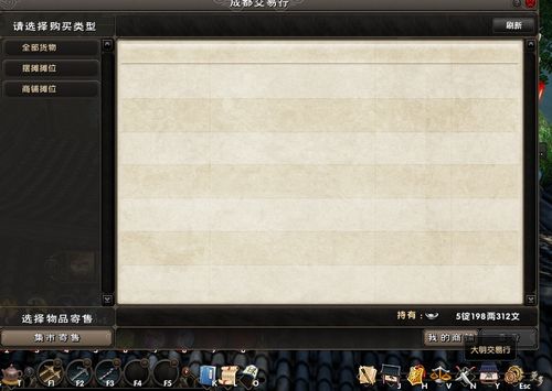 玩家购买物品可通过大明交易行进行搜索,可进行全部货物搜索、摊位搜索和商铺摊位搜索。在全部货物搜索中,玩家可以根据不同的分类不同的等级进行搜索,同样可以直接输入想要购买的物品进行搜索。而摊位搜索是搜索摊位名称,譬如某摊位出售“雁行功”,但是其摊位名称上没有雁行功字样,那么摊位搜索是无法搜索到的,摊位搜索主要适用于搜索系列物品,如“四开单剑”、“开光材料”等。商铺搜索则在世界商铺出售的商品中搜索。勤搜索,快致富。勤摆摊,致富快。