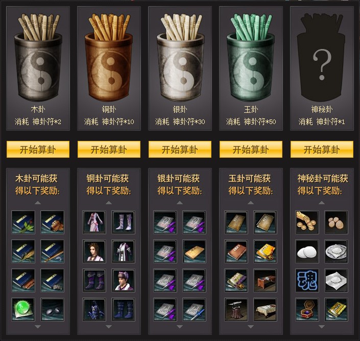 不同卦筒算卦,消耗 “神卦符”的数量均不同。