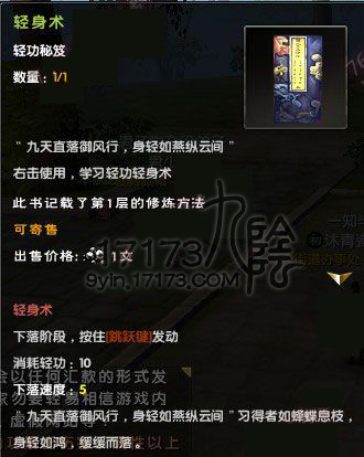 九阴真经轻功“轻身术”目前已于武侠服中投放,为雁门关禁地掉落!