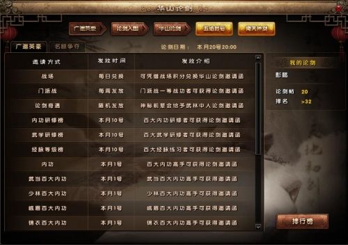 九阴真经新版本“华山论剑”的系统将根据江湖中玩家的武学实力、正邪声威、战场、门派战等排行,向江湖中排列前茅的玩家随机发放不同数量的“华山论剑邀请函”,邀请函使用后将获得10份“论剑帖” ,邀请函是有有效时限。