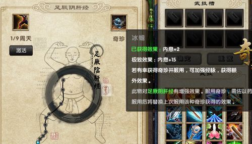 奇珍是散落江湖的一些珍稀物品,服用后能获得对经脉的加强效果,每一条经脉有一种奇珍能对其加强。服用奇珍时需要购买药引,可选择使用碎银或官银支付,服用效果分为十种档次,每次服用奇珍都会替换上次的效果,当玩家服用奇珍获得了最高档次的效果时,将不能继续服用此种奇珍。奇珍可增强一定的基础属性,服用档次不同奇珍所增加的效果亦会有所区别。