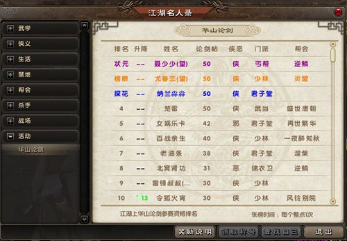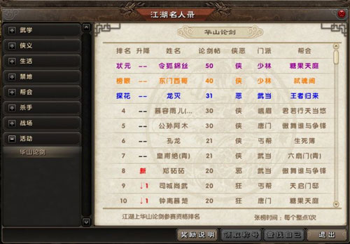 《九阴真经(新手、门派、轻功、奇遇)》武林大会华山论剑线上赛昨日开赛,从昨天开服比赛到现在,每个服务器都人气爆棚,酣畅淋漓的打斗声充分体现此次武林大会线上赛带给玩家们无限的激情。经过昨天24小时的比赛,每个服务器都涌现出了许多实力很强的玩家,他们通过各种玩法赚取“论剑贴”,在华山论剑积分榜拔得头筹,占据有利的排名,为最后的巅峰对决迈出了第一步。