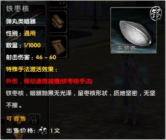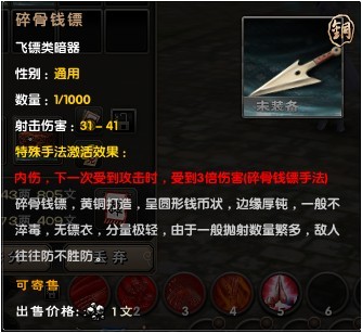 此暗器手法专门为唐门和锦衣卫门派所设,中暗器之人移动速度降低30%,持续10秒。远程攻击技能可利用此时间有效控制击杀对手,神技!