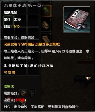 控制流手法之最!当敌手使用太极剑舞等移动性大招伤害技能时,一但中此暗器手法,将只能原地空放技能,毫无建树。或在打斗中自身处于弱势时,可利用此手法控制对手,利用10秒时候使用天马换血或使用药品补给。