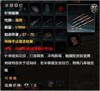 此暗器手法专门为唐门和锦衣卫门派所设,中暗器之人移动速度降低30%,持续10秒。远程攻击技能可利用此时间有效控制击杀对手,神技!