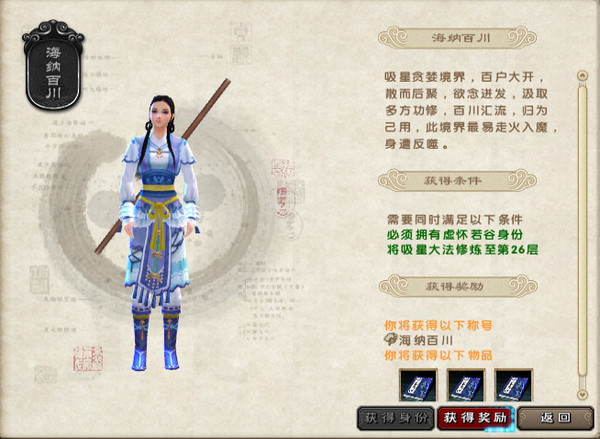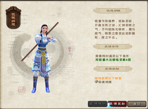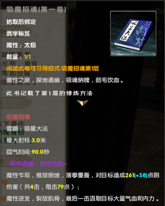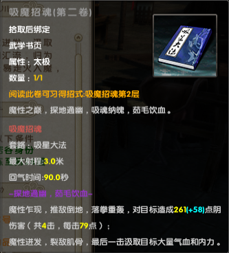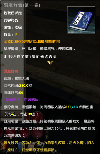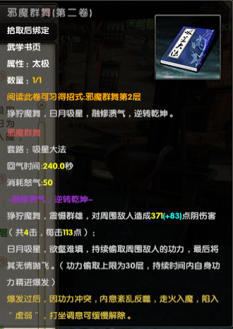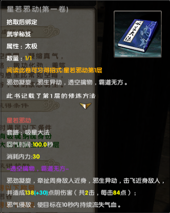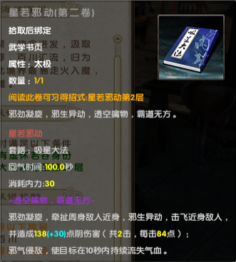 吸星邪法:吸取目标溃散的修为,极大的提升自己的能力,提高自身的气血上限和内力同时自己的基础属性再提高10%最多可叠加20层,并红在一段时间内免疫所有的移动控制效果。