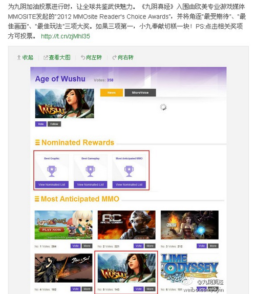 同时,刚刚在金翎奖中斩获三项大奖的《九阴真经》,紧跟时代的步伐,不仅在北美、俄罗斯成功开测,还入围了由欧美专业游戏媒体MMOSITE发起的“2012 MMOsite Reader's Choice Awards”,与众多欧美游戏大作同台角逐“最受期待”“最佳画面”“最佳玩法”三项大奖,支持九阴真经的玩家们可以前往这里:http://event.mmosite.com/gameprize/?action=gameinfo&gid=72