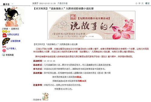 另一方面,继论坛“可曾记得爱”之后,论坛再推主题为“2012、我的登船行囊”活动与“说故事的人”九阴真经微小说比赛。玩家们纷纷参与了进来,写下了自己的答案或遇到的江湖故事。其中微小说比赛与官方微博同步展开。其中有创意或者有趣的故事将有机会被九阴官方电子杂志《茗剑》收录。