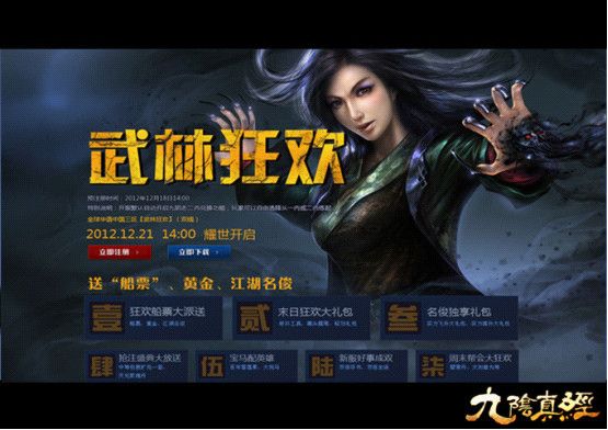 12月21日下午14:00,《九阴真经》再添新服一组,全球华语中国三区双线新服武林狂欢火爆开启,七大活动联袂对抗末日,“船票”、黄金、江湖才俊一个不能少!海量豪礼、无限魅力,再现九阴江湖情!
