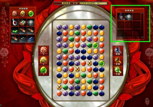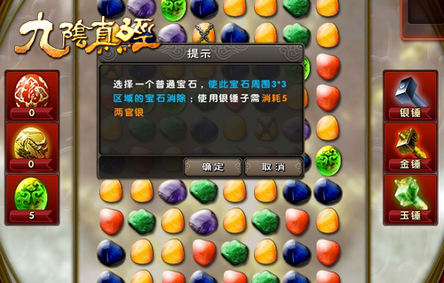 游戏开始后,前面放置的礼蛋会随机出现在图形阵中,礼蛋不可被移动和消除,通过移动消除普通宝石或使用锤子,让礼蛋下落到棋盘最底层,将其砸开即可获得奖励。银锤:选择一个普通宝石,使此宝石周围3*3区域的宝石消除,使用银锤子需消耗5两官银。金锤:选择一个普通宝石,使棋盘上所有同色宝石消除,使用银锤子需消耗10两官银。玉锤:选择一个普通宝石,消除此宝石所在列的所有宝石;使用玉锤子需消耗20两官银(每使用1次玉锤,将获得多开启1次砸蛋有礼的机会)。
