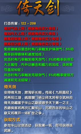 如图所示,倚天剑被攻击时有百分之五的几率免缴械并获得霸体效果,攻击时有百分之五的几率获得五大主属性: 体魄 内息 臂力 罡气 身法。内功暴击 外功暴击 内功威力 等等获得加成效果。那么对付倚天剑最好的办法是什么? 人多? 错!