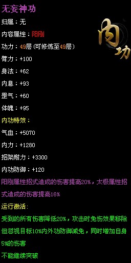 特效 降低所受伤害的20%,仅仅这一点就无愧最强大的防守特效。相当于平添了2400左右的外防和**点内防(这个记不得具体多少对应多少了)。忽视目标10%的内外功防御减免,相当于平减了对方1200左右的外防和某值的内防,也是挺不错的效果,加额外5%的伤害。万金油特效配合万金油属性加成,这内功除了阴柔武学不适合外,其他任意武学用着都不错
